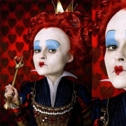 不思議の国のアリスの原作にはない赤の女王(The Red Queen 鏡の国のアリス編)はヘレナ・ボナム=カーター(Helena Bonham Carter )で、彼女の母親は、こんなキャラクターに娘をしなくってもいいじゃない!と激怒するらしいが、このメイクもすごい。メイクアップアーチストには Corinne Bossu、Susan Stepanianらが。、ヘアスタイリストのPaul Mooneyなどのほかに、「special makeup effects artist 」なんていうスタッフも勢ぞろい。
